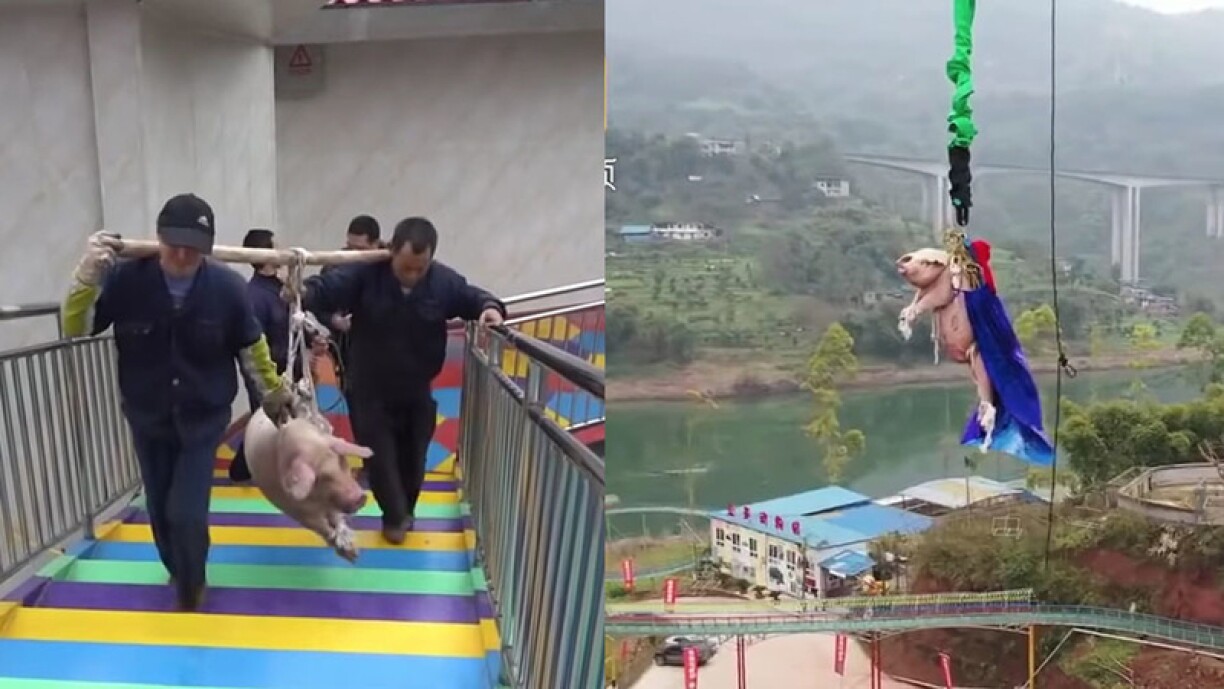 The video shows the pig being tied to a pole and carried to the top of a tower by two men, before being pushed off a ledge. Park officials said the stunt was a publicity stunt to mark the opening of the new bungee attraction.