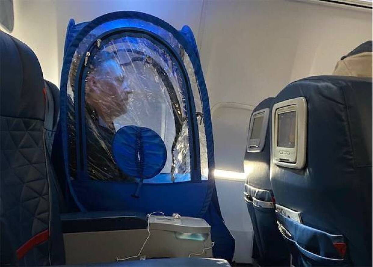 On his blog, his brother wrote: “As travellers are taking unusual steps to protect themselves from the coronavirus, from wearing water jugs on their heads to covering themselves in plastic tarps, my brother thought to see how his StadiumPod ... would work on an airplane.”