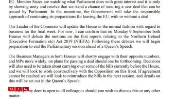 Parliament returns for Queen’s speech on 14 October.