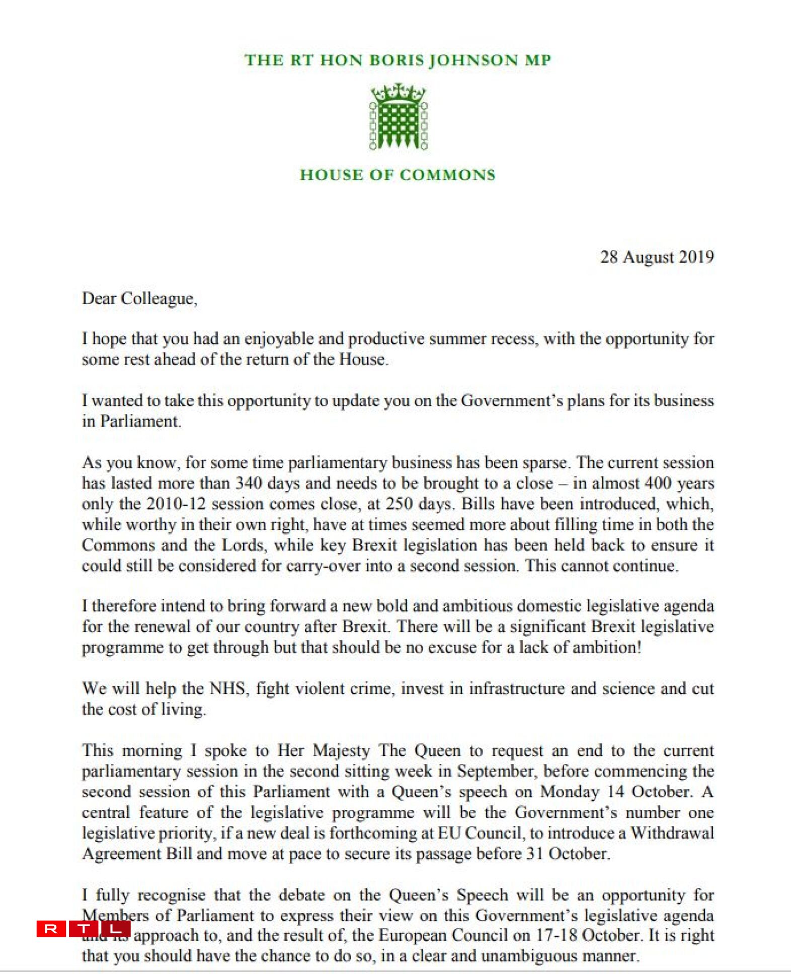MPs will then not return to Westminster until 14 October, when he said there would be a new Queen’s speech, setting out what he called a “bold and ambitious domestic legislative agenda for the renewal of our country after Brexit”.