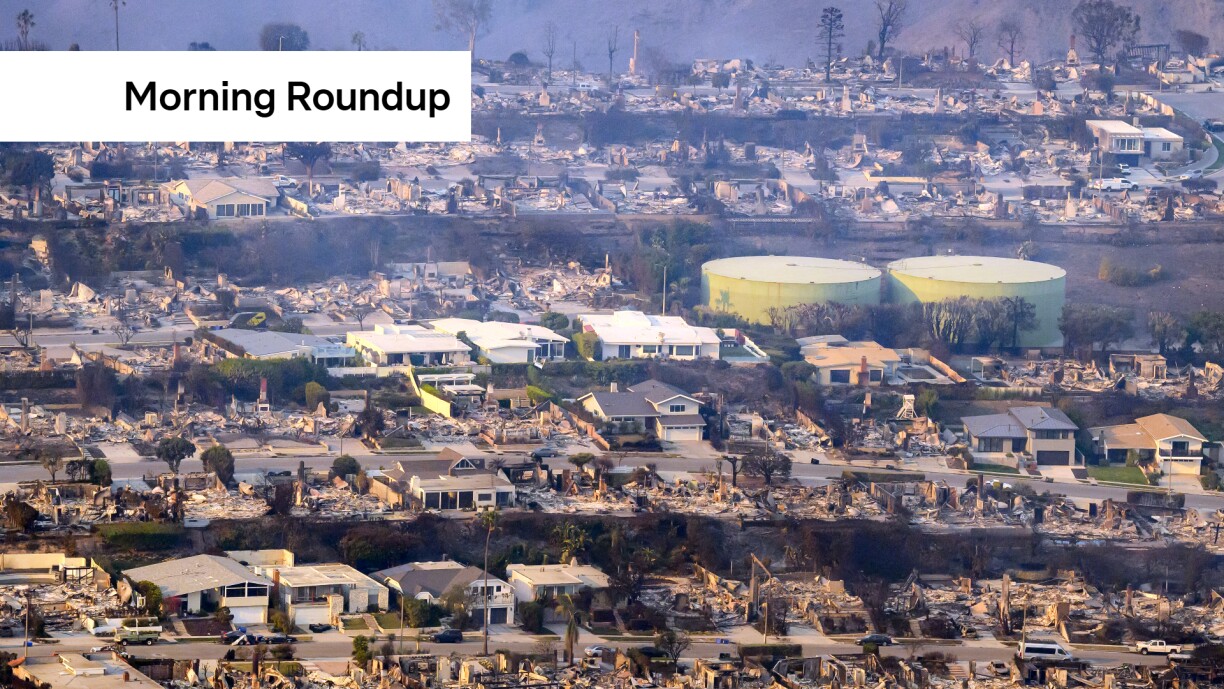 LA FIRES – Officials in Los Angeles say more than 9000 homes and other structures have been damaged or destroyed in the wildfires sweeping the Californian city. The number of confirmed dead has now risen to at least 10. The search is ongoing for further casualties. LA police say one of the blazes in the west of the city was started deliberately. They are treating it as a crime scene. A suspect is in custody and set to be questioned.