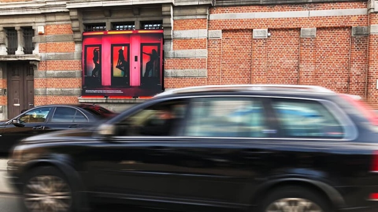 The poster, which depicts outlines of women in suggestive poses under neon red lights, was installed by the communications agency Mortierbrigade in Brussels after a 14-year-old girl was knocked down in a street near the agency’s offices.