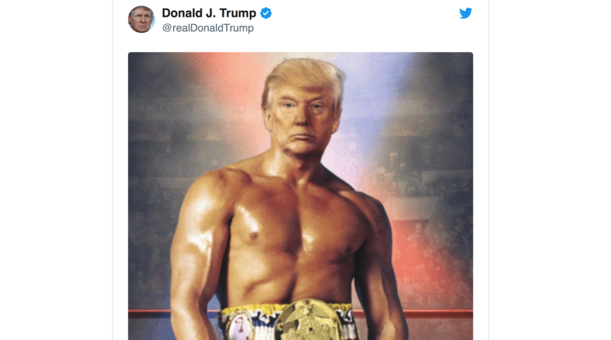 In the picture, Trump’s head is superimposed on the hulking body of a boxer -- an image taken from the publicity poster for the Sylvester Stallone movie “Rocky III.”