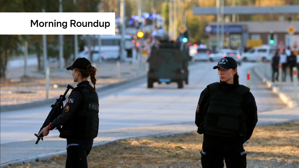 TURKEY ATTACKS – Turkey says its military has struck sites in Iraq and Syria linked to Kurdish separatists, in response to an attack on the Turkish Aerospace Industries headquarters in Ankara yesterday. Turkey blames the outlawed Kurdistan Workers’ Party, the PKK. Five people died in the attack and 22 were wounded.