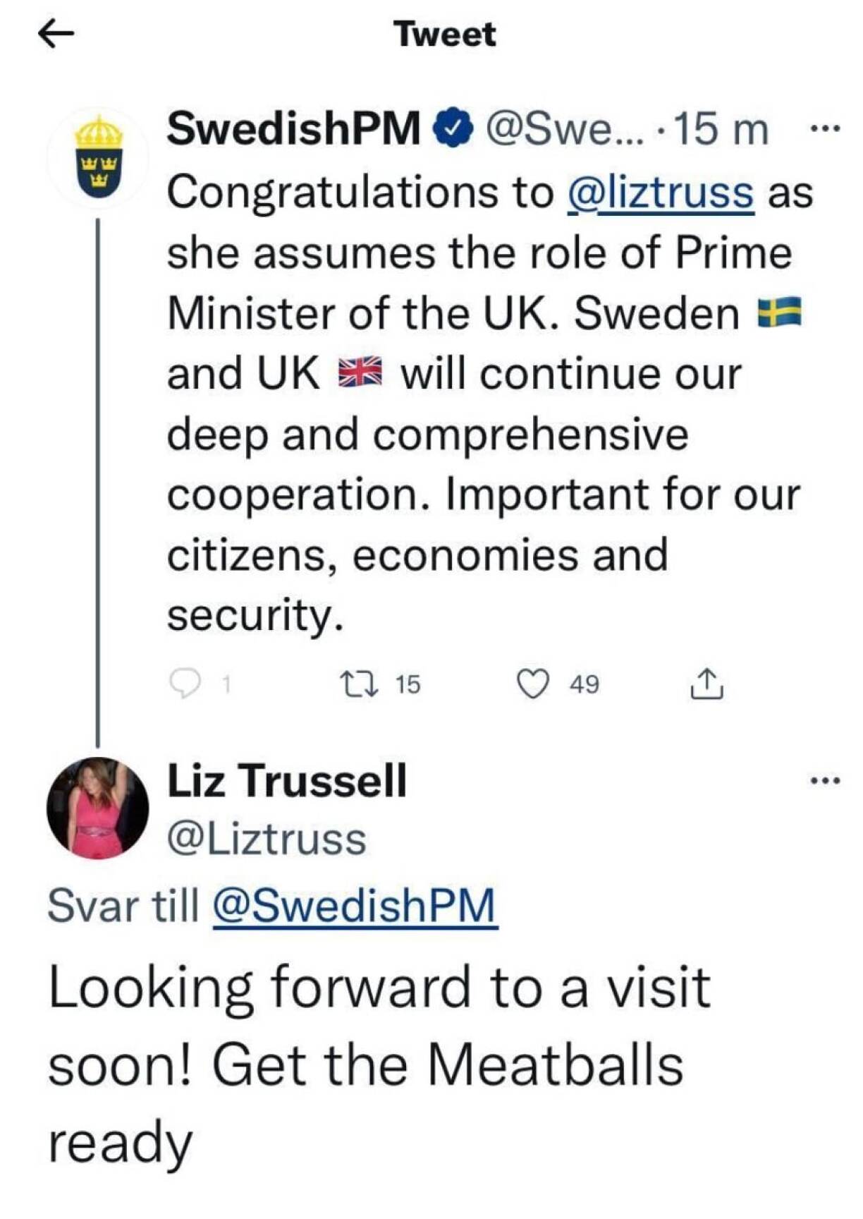 “Congratulations to Liz Truss,” Andersson wrote, adding that “Sweden and Great Britain will continue our deep and extensive cooperation”.