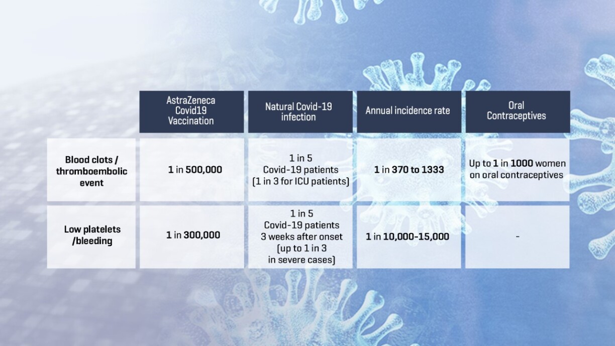 An analysis done by the EMA and other organizations comparing the incidence rate of thromboembolic events in the general population with what is being reported in people following AstraZeneca vaccination showed that 37 reports for thromboembolic events are actually lower that what you would expect. Indeed the data suggest that the rate of incidence of blood clots and bleeding after vaccination with the Covid-19 AstraZeneca vaccine is lower than the risk of such side effects with other common medication, natural infection with Covid-19 or indeed the annual incidence rates in the general population. In the Astra Zeneca clinical trials described above incidence of thromboembolic events was also lower in the vaccinated group compared with the control group, even though the number of events in total was small.