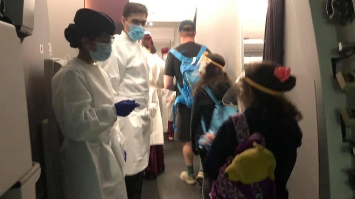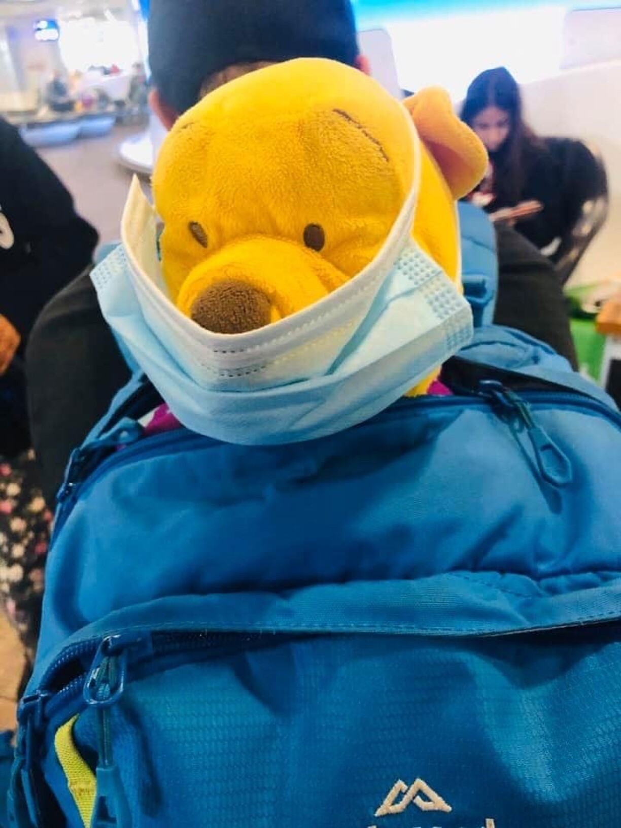 We were asked to wear our blue face masks and a clear protective face mask as well. They said we would have to wear this for the entire flight, even in transit, except when eating during the flight.