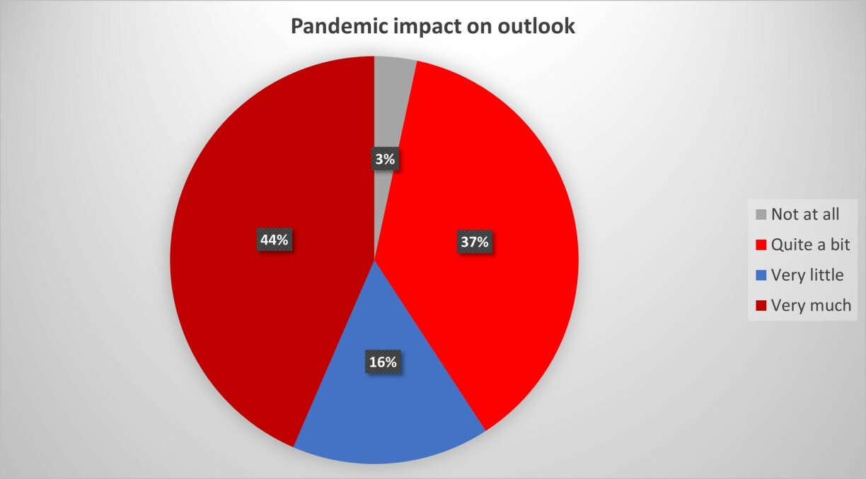 Among respondents who said the pandemic very much impacted their outlook, 64% generally felt pessimistic, 19% felt some degree of optimism, and the remaining 17% were neutral.