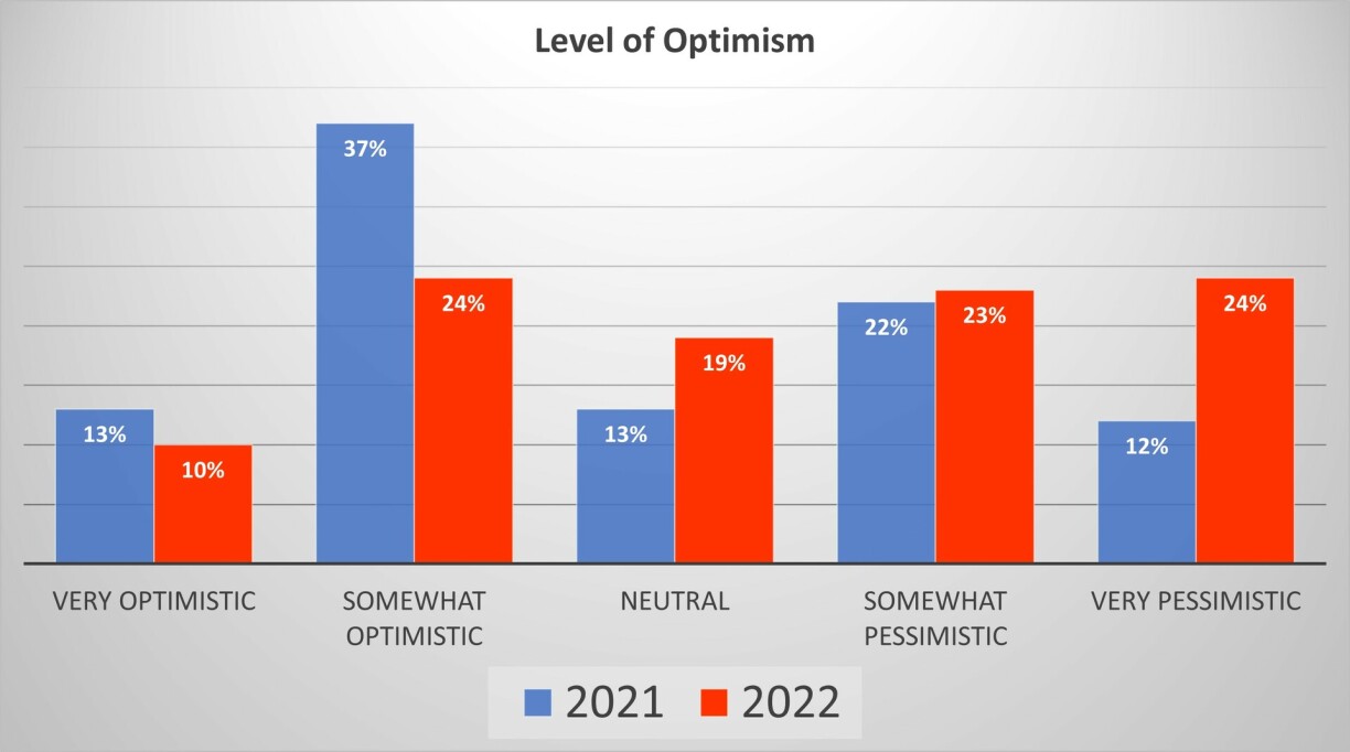 Looking at the graph of your answers, there’s been a clear shift towards pessimism as compared to how you report having felt entering 2021.