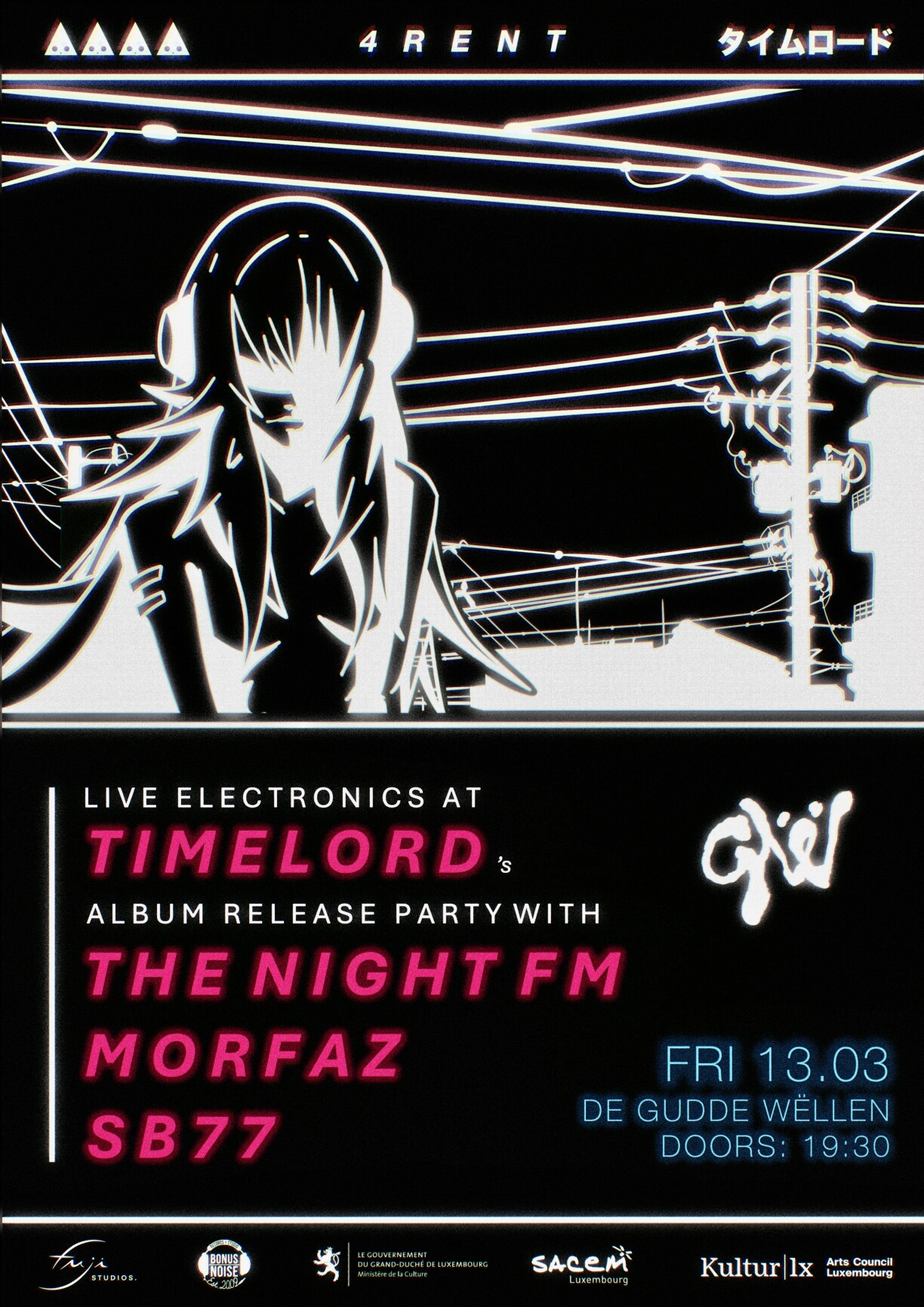 To celebrate the release of 4RENT, Timelord will host a special release show in Luxembourg featuring the artists who collaborated on the album. The event will take place at De Gudde Wëllen, with doors opening at 19:30 and the show beginning at 20:00.