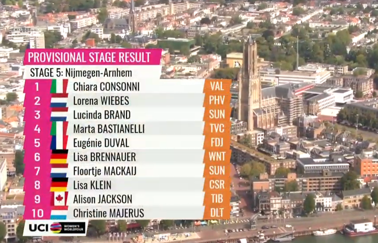 The final stage culminated in a mass sprint for the title, as Chiara Consonni took on her competitors Lorena Wiebes and Lucinda Brand to come first, but Christine Majerus grabbed 10th place with the same time as the other nine racers, thus securing her overall victory.