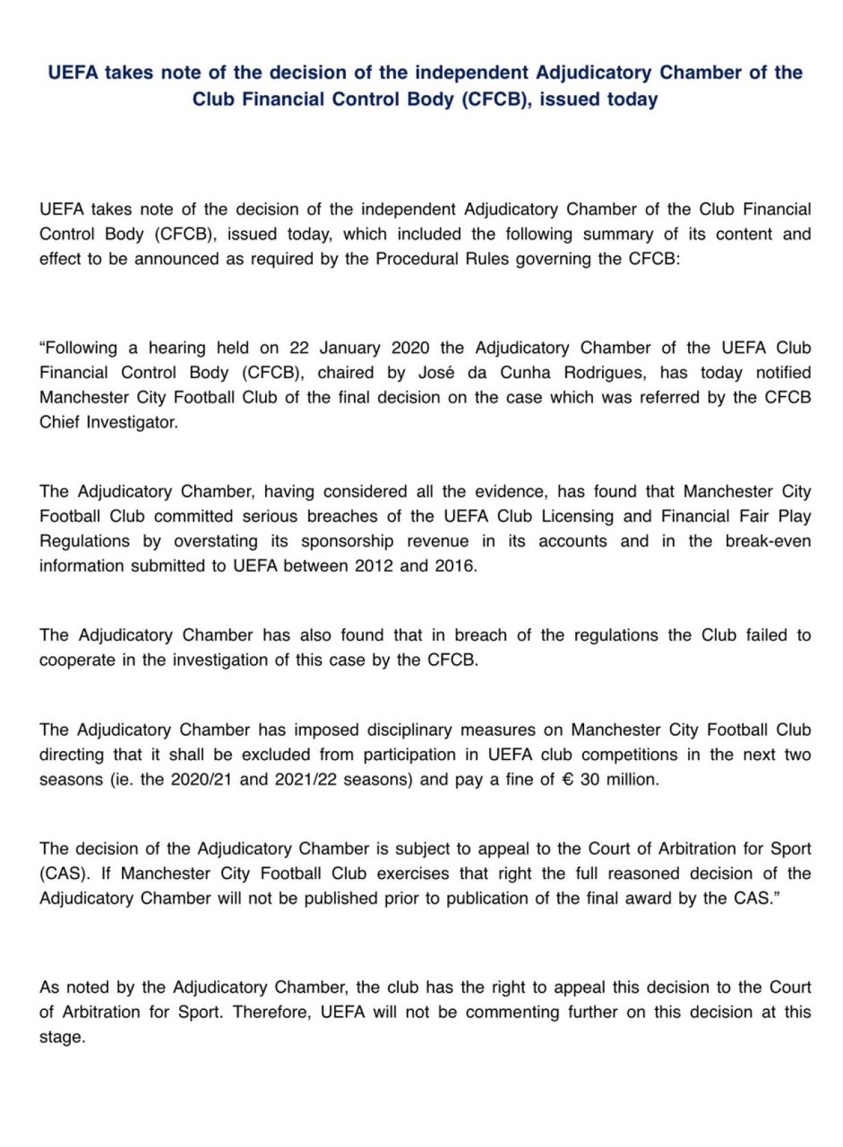 Manchester City have stated that they will appeal against the decision.