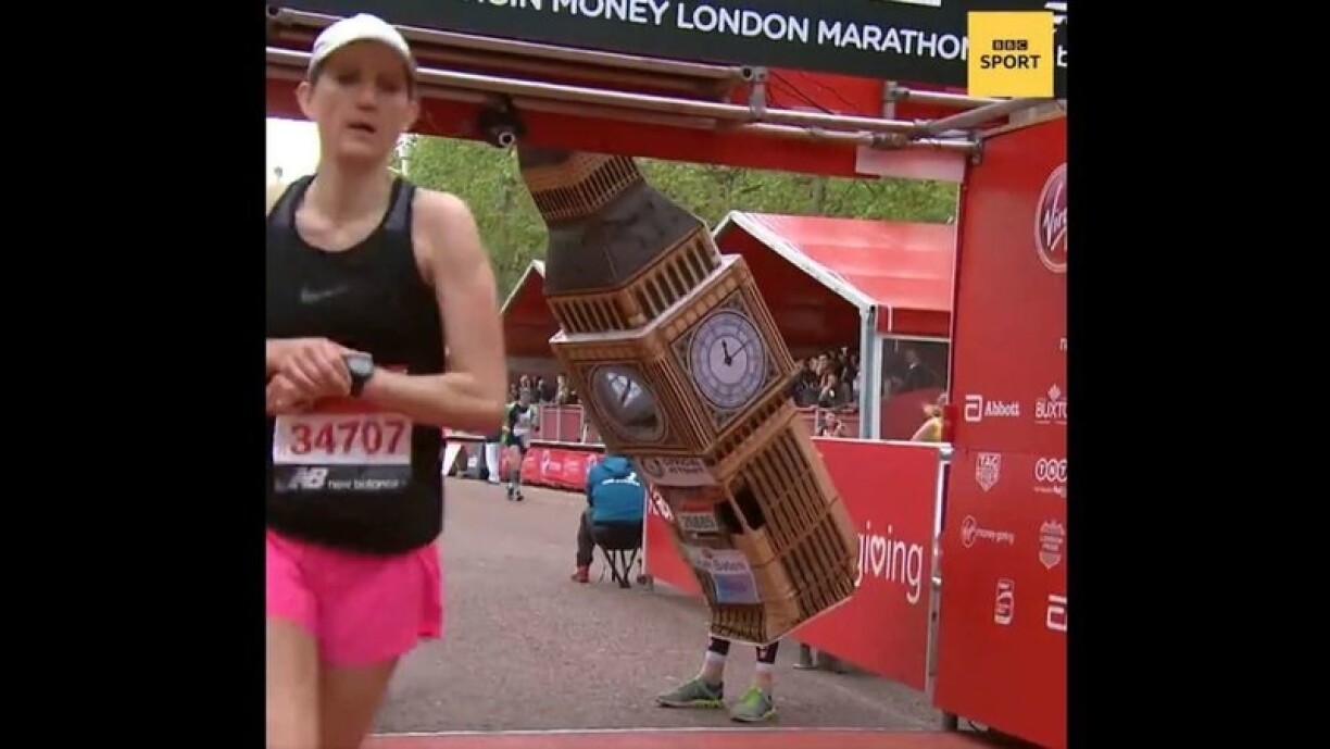 Having run a full marathon (26.2 miles, 42.2km) dressed up as Big Ben, one runner encountered a final and rather unexpected obstacle - he couldn’t actually get across the finishing line.