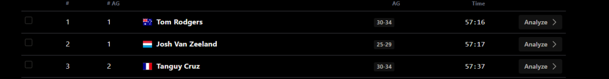 Despite the struggle, he finished second overall and first in his age category – just one second behind Elite 15 athlete Tom Rodgers. Even in what he called a “disappointing” race, he improved his average time to 56:19, climbing from 18th to 14th place and securing a spot in the coveted Elite 15. As he humbly reflected: “It’s not a failure but a data point.”