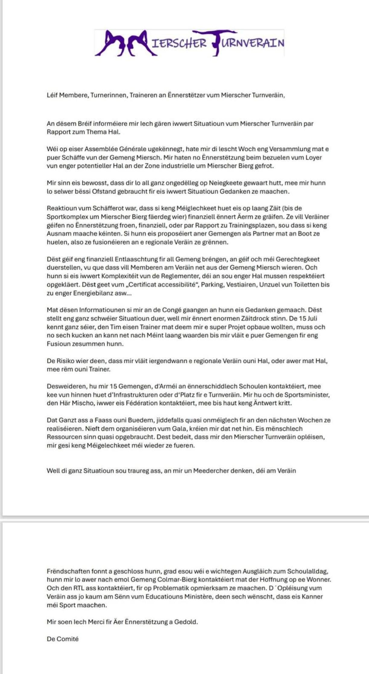 Starting next week, on 28 April, club members and representatives from the municipality will publicly share their perspectives with our colleagues at RTL.lu. The Minister of Sport has also been informed about the situation and is expected to comment.