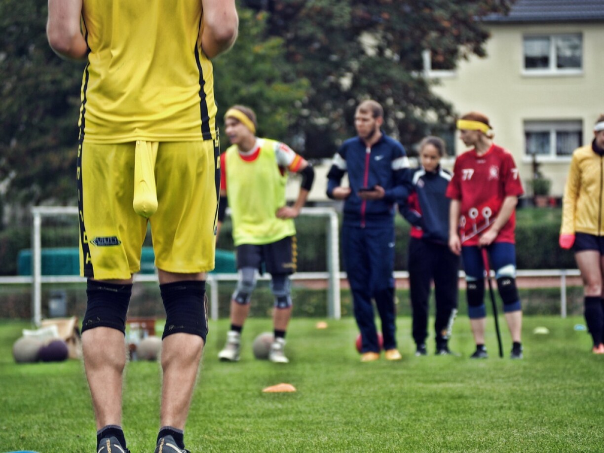 Muggle Quidditch is something of a mixture between handball, rugby and dodgeball - with the distinction that all players are sat on broomsticks. It is a mixed-gender contact sport and definitely not for people afraid of a bit of friendly roughhousing.